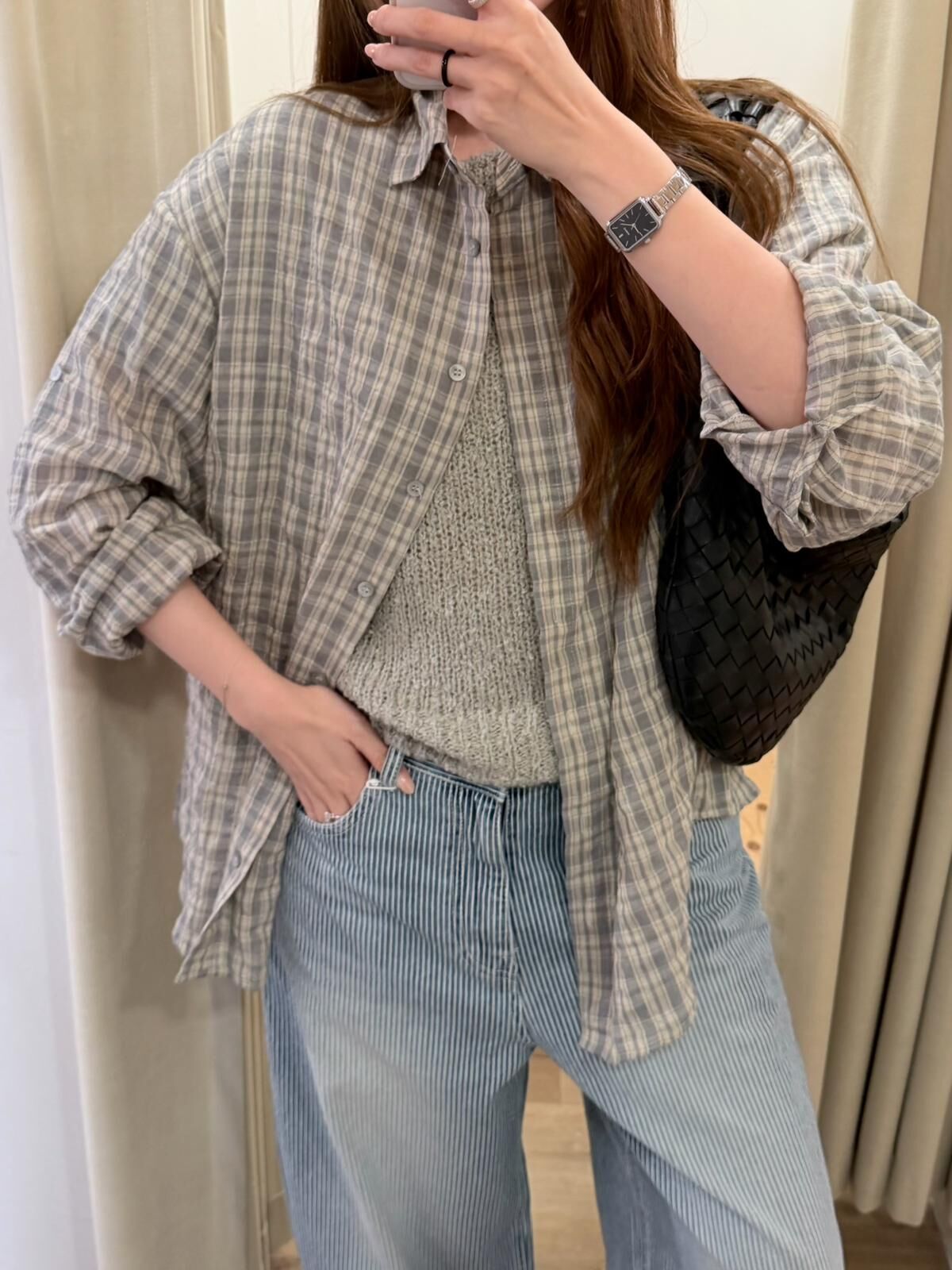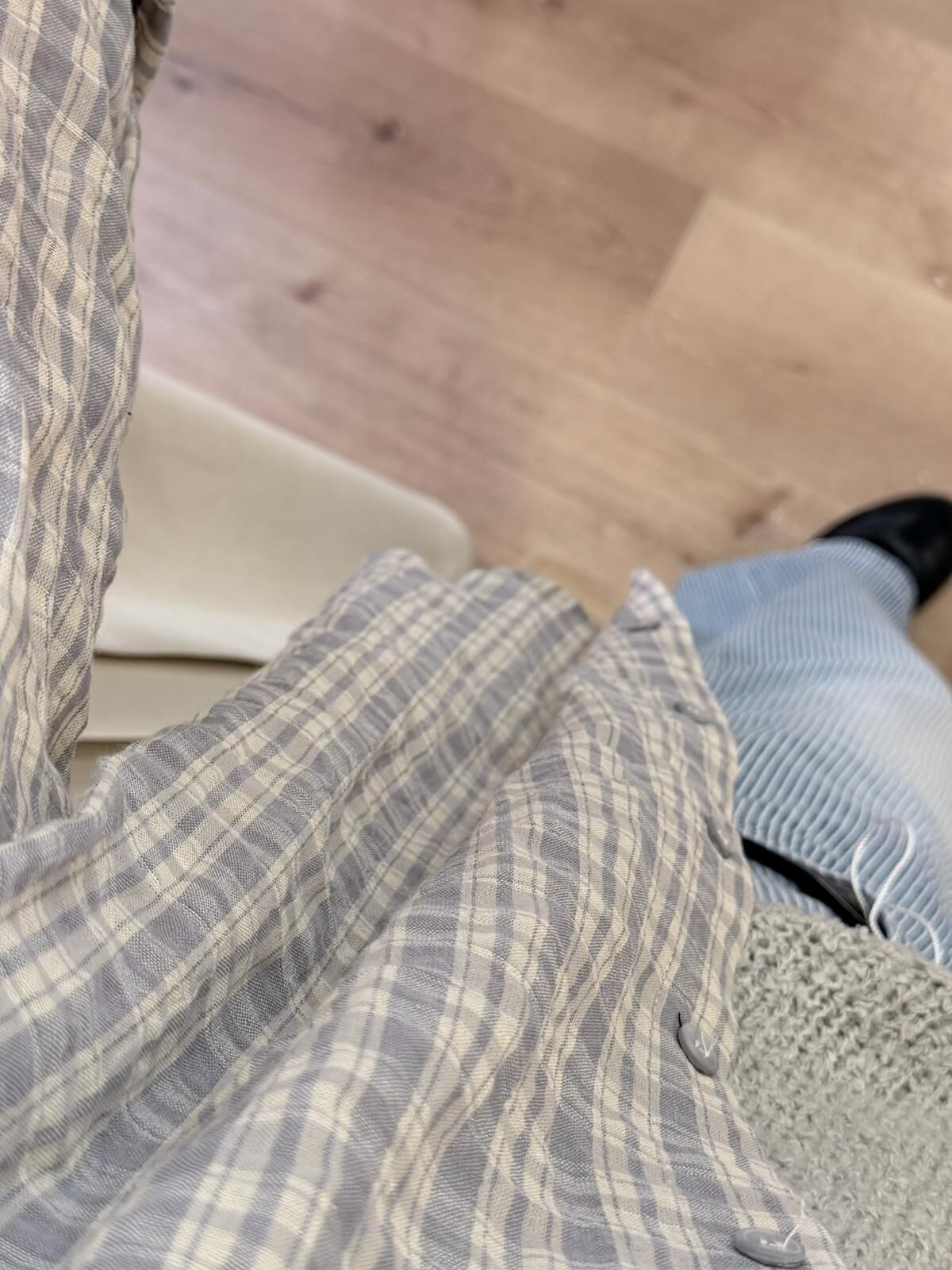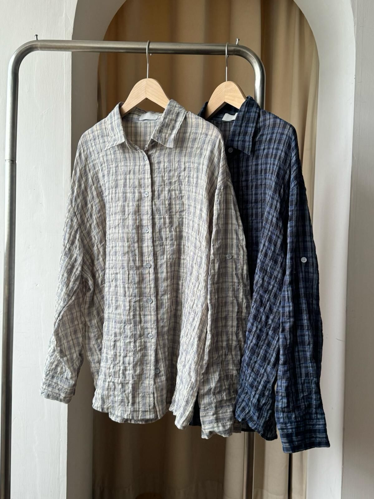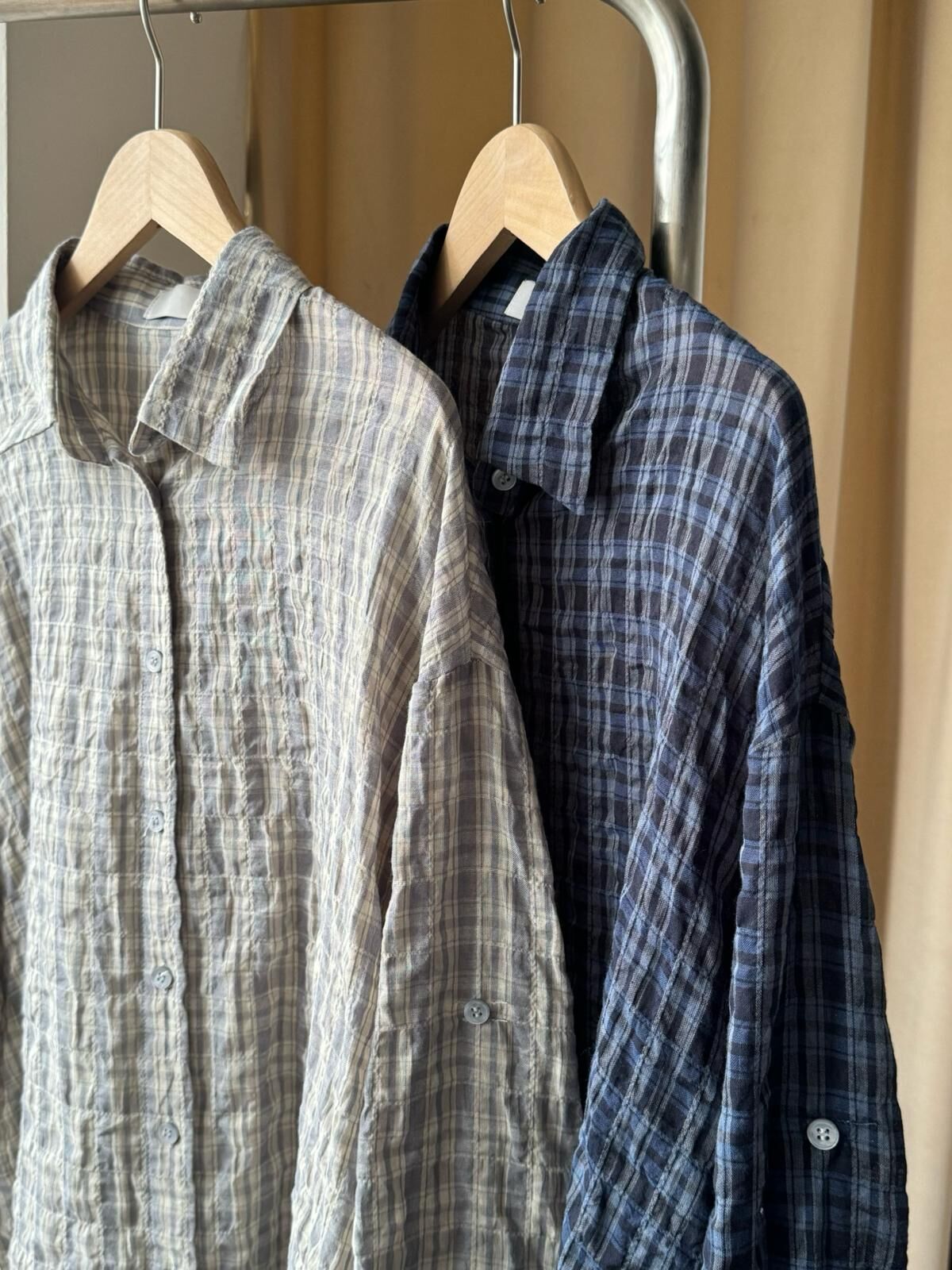 [現貨/預訂]微皺感格子透條襯衫(灰/藍)